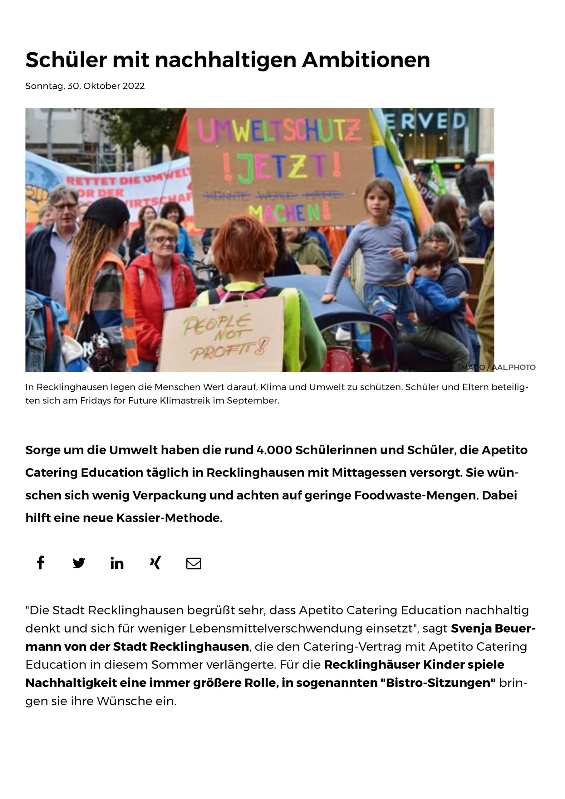 Sorge um die Umwelt haben die rund 4.000 Schülerinnen und Schüler, die apetito catering Education täglich in Recklinghausen mit Mittagessen versorgt. Sie wünschen sich wenig Verpackung und achten auf geringe Foodwaste-Mengen. Dabei hilft eine neue Kassier-Methode.